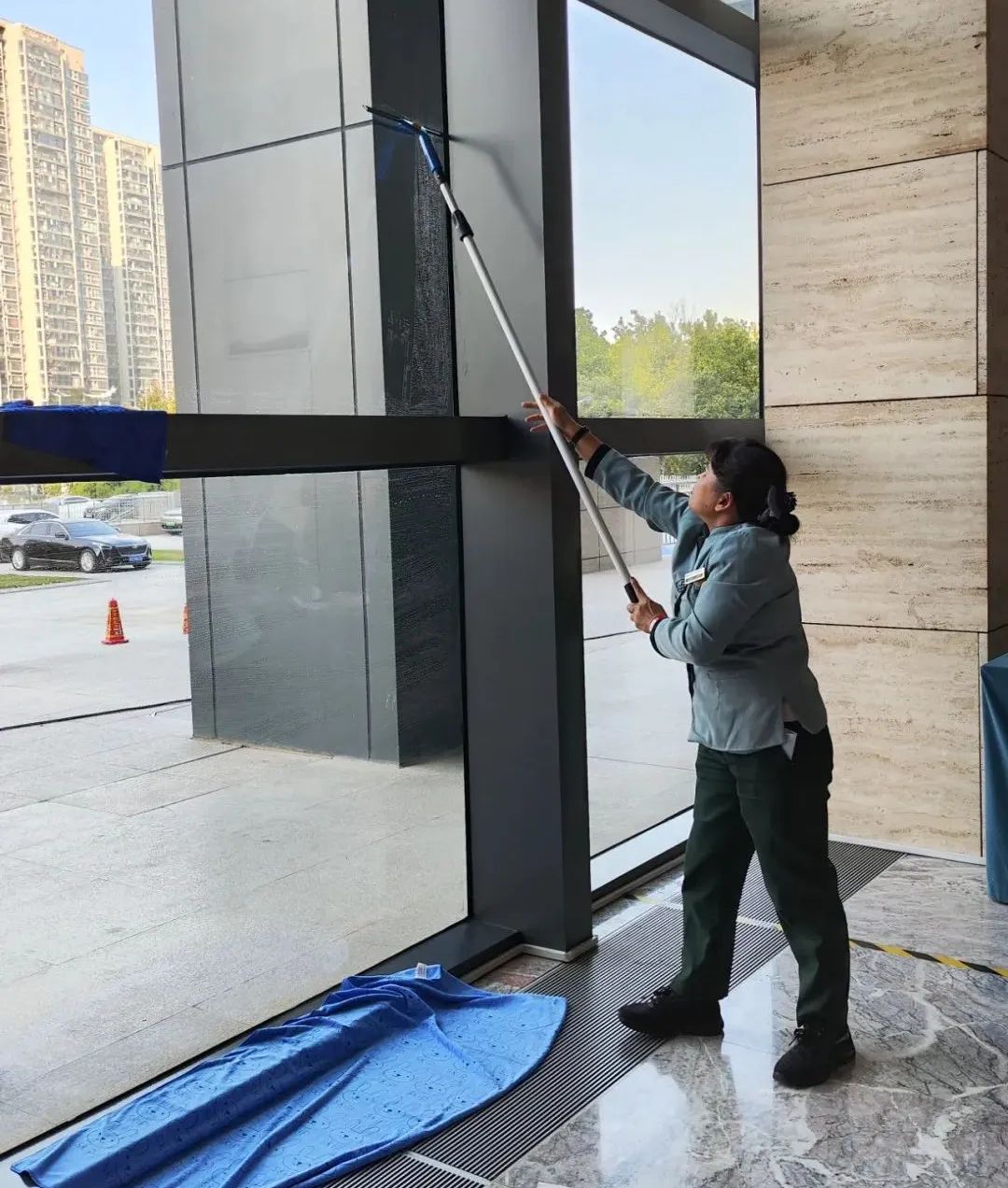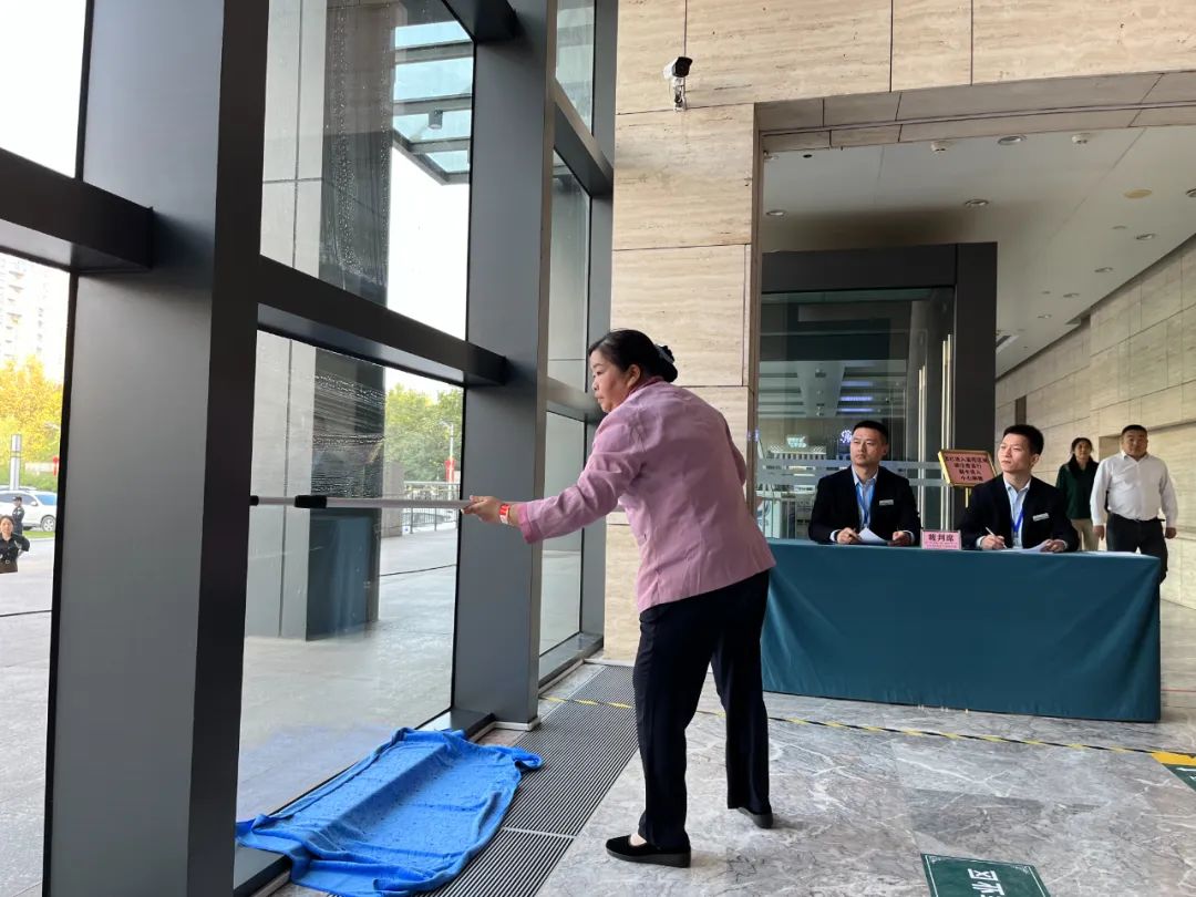 來到“玻璃刮拭”賽區(qū),在參賽選手準(zhǔn)確配比清潔溶液,迅速有章的涂抹、刮拭等一套專業(yè)技操之后,一塊干凈明亮的玻璃展示在我們面前。